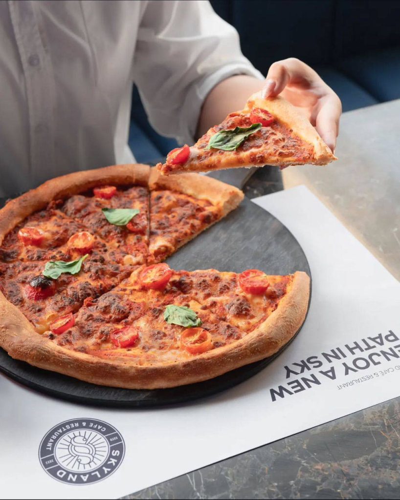انواع پیتزاهای ایتالیایی، پیتزاهای خاص با سسهای اختصاصی، برگرهای حجیم و خوشمزه، انواع فستفود و سوخاریهای ترد در کافه رستوران اسکای لند در جزیره کیش سرو میشود.
