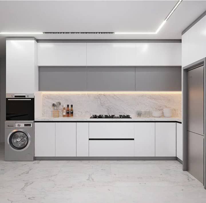 برای خانههایی با طراحی معاصر، کابینتهای مدرن چوبی با دربهای صاف (Slab Doors) و دستگیرههای مخفی یا خطی، سادگی و کارایی را به نمایش میگذارند. در این سبک، تمرکز بر خطوط مستقیم و استفاده از پوششهای مات یا براق روی چوب است تا ظاهری شیک و بدون پیچیدگی حاصل شود.