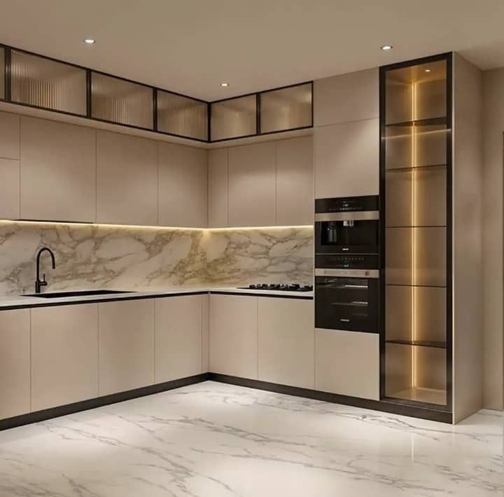 اگر به دنبال شکوه و تجمل هستید، کابینتهای کلاسیک با دربهای قابدار (Frame & Panel)، تزئینات پیچیده (Molding) و سرستونهای حکاکی شده، انتخابی بینظیر هستند. استفاده از رنگهای کرم، سفید استخوانی و قهوهای تیره در این سبک، فضای آشپزخانه را به یک تالار پذیرایی مجلل تبدیل میکند.