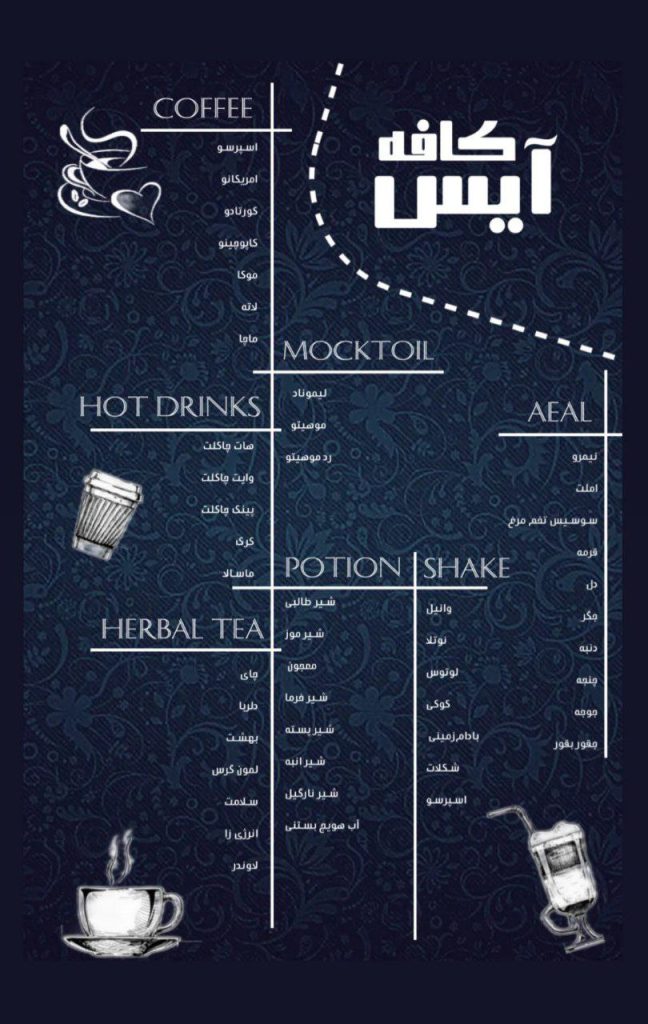 منوی متنوع کافه آیس در صفاییه یزد 🍹🍵🍴