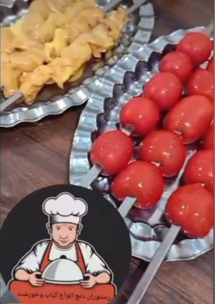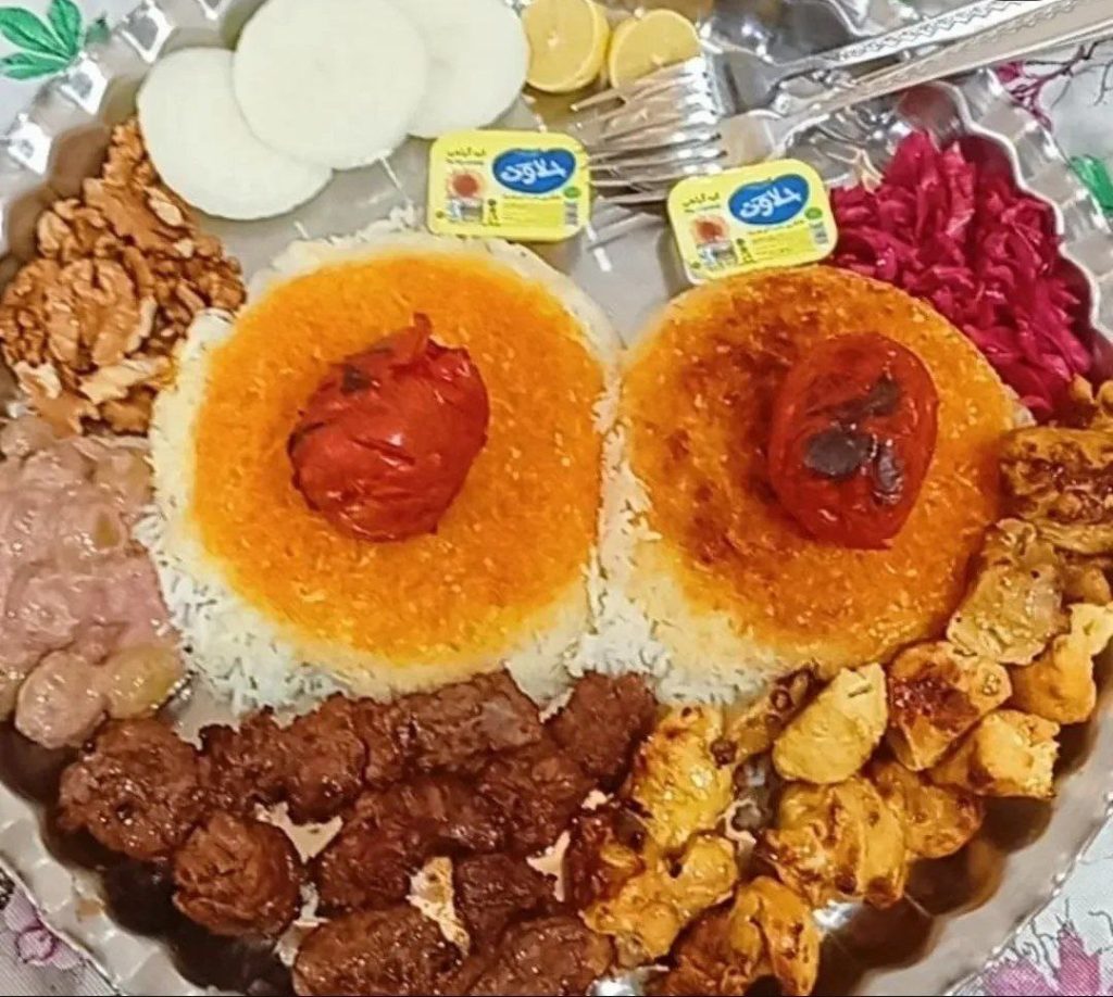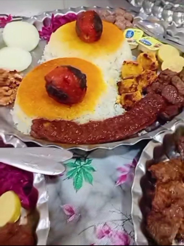 چنجه ۱ سیخ، برنج ۱ پرس، زیتون پرورده، گردو، گوجه، کره و ترشی