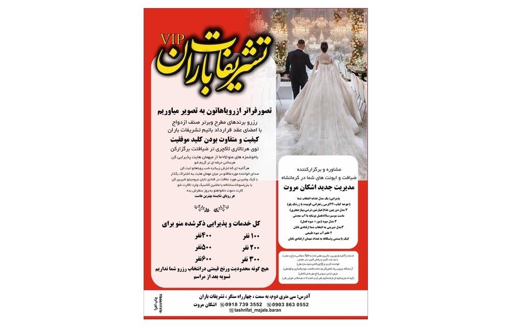 تشریفات مجالس باران در کرمانشاه، با مدیریت کارآمد و دقیق آقای اشکان دوست، پکیجی کامل از خدمات تشریفات عروسی، تولد و نامزدی را ارائه میدهد. تمرکز بر فضای لوکس و مدرن، دکوراسیون هنرمندانه و پذیرایی در بالاترین سطح، مجموعه تشریفات مجالس باران را به انتخابی ایدهآل تبدیل کرده است. برای داشتن خاطره اعتماد به تیم مجرب تشریفات مجالس باران در کرمانشاه، تضمینکننده موفقیت مراسم شما خواهد بود💖.